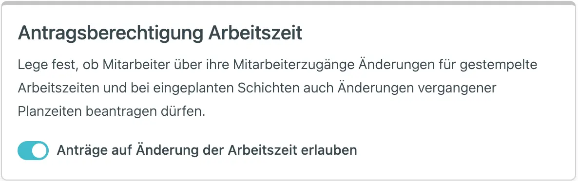 Damit Ihre Mitarbeiter vergessene Zeiten oder Planänderungen nachtragen können, aktivieren Sie in den Auswertungseinstellungen die Funktion Antrag auf Änderung der Arbeitszeit erlauben.