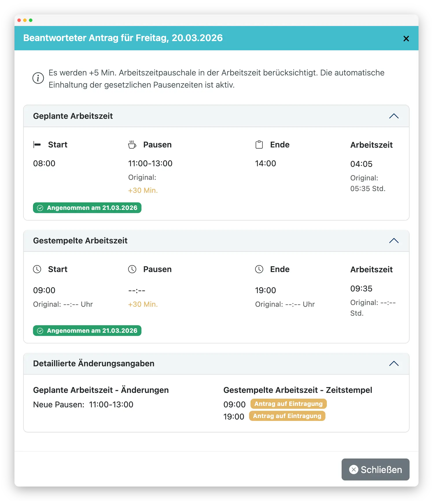 Sobald der Antrag beantwortet wurde, wird eine angenommene Zeit sofort in die Auswertung übernommen. Die bearbeiteten Anfragen bleiben zur späteren Nachvollziehbarkeit weiterhin im System gespeichert.