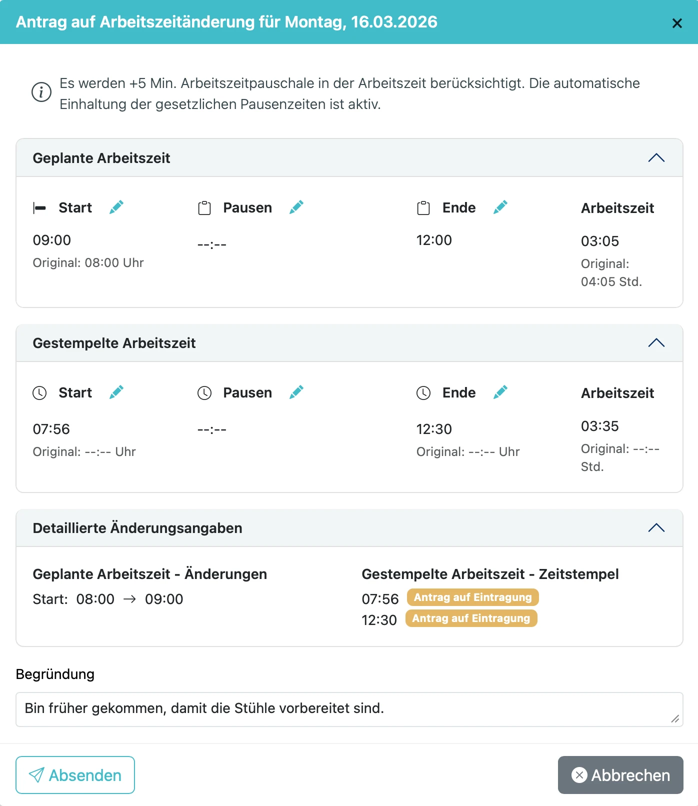 Zusätzlich sollte eine kurze Begründung (z.B. "Stempeln vergessen") eingetragen werden. Mit Absenden landet die Korrektur direkt bei den Admins zur Freigabe.