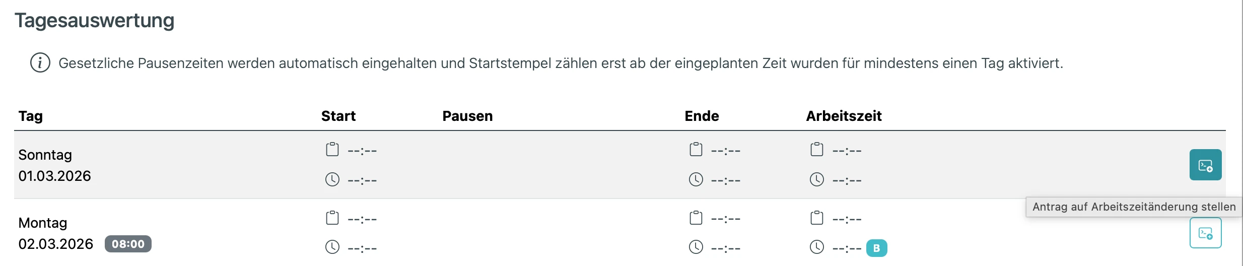 Danach können Mitarbeiter in ihrer Monatsauswertung Korrekturen für vergangene Tage anfragen, also für den gestrigen und ältere Tage.